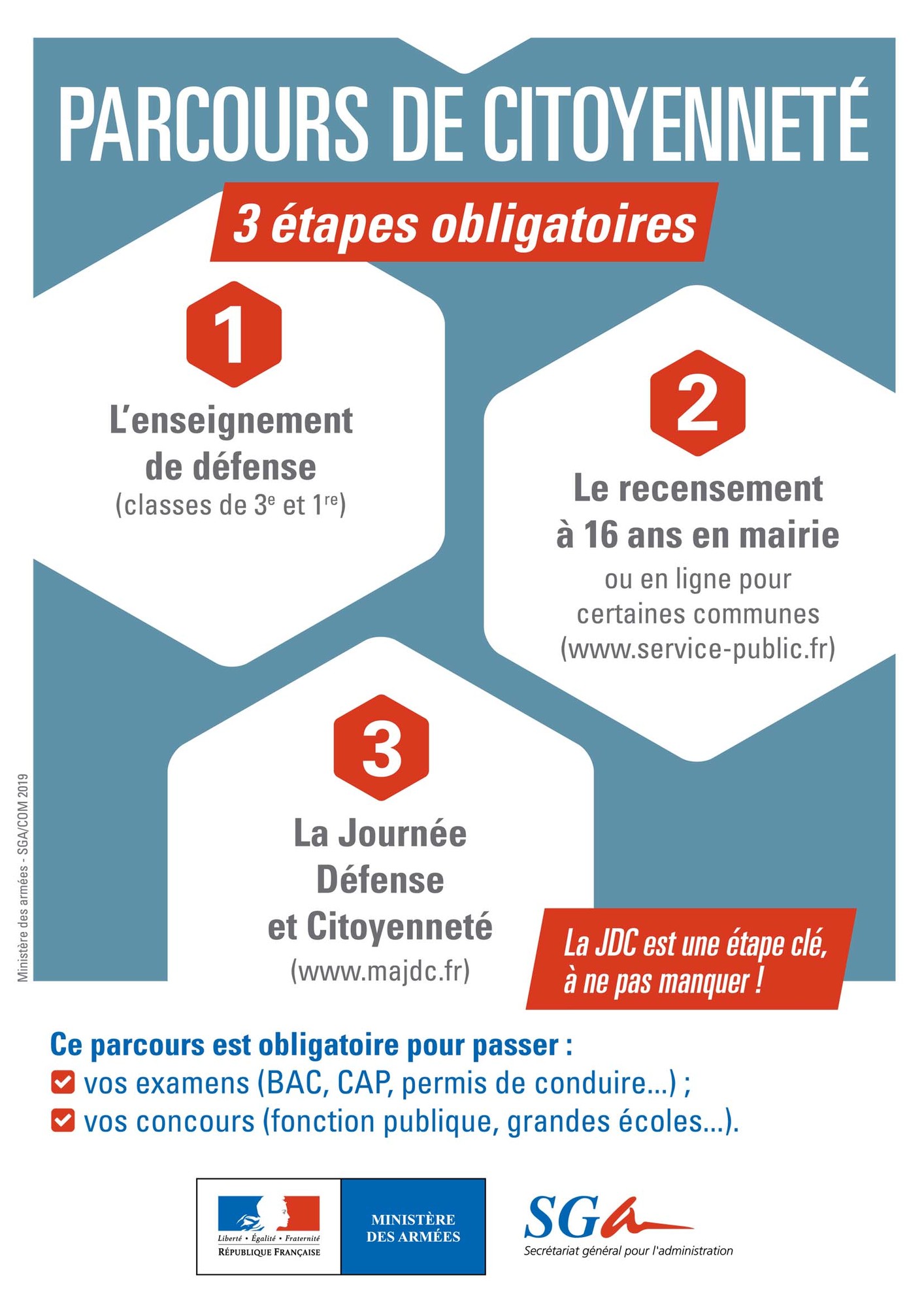 La JDC est la troisième étape du parcours de citoyenneté obligatoire pour tous les jeunes de nationalité française : la première étape est l’enseignement de défense dispensé en classe de troisième dans le cadre des cours d’enseignement moral et civique ainsi qu’en classe de première dans le cadre des cours d’éducation civique, juridique et sociale, la seconde étape étant le recensement obligatoire en mairie.