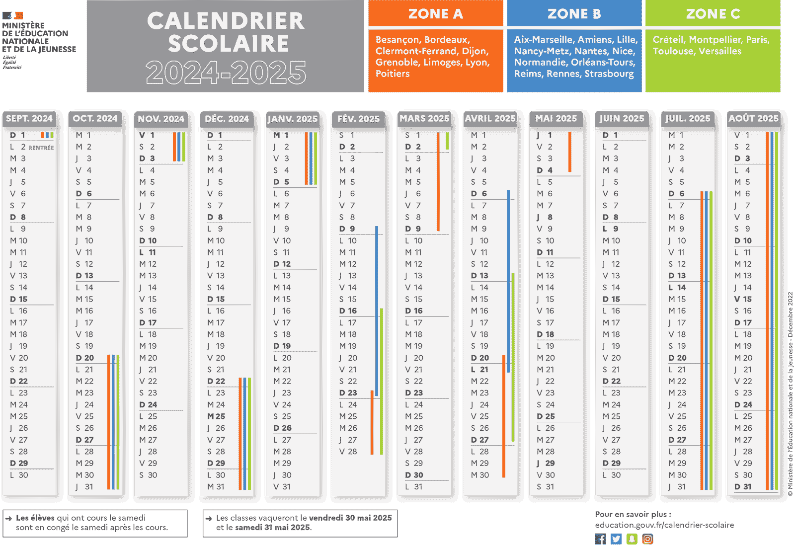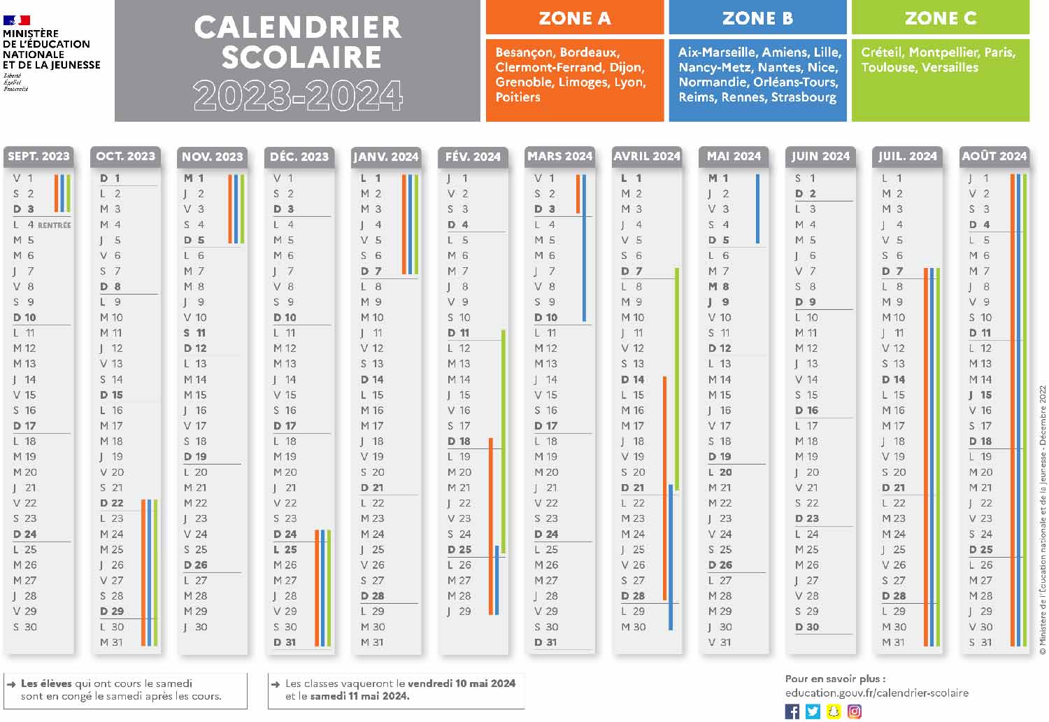 Vous trouverez ci-dessous le calendrier scolaire officiel, publié par le Ministère de l’Education nationale, de l’Enseignement supérieur et de la Recherche.